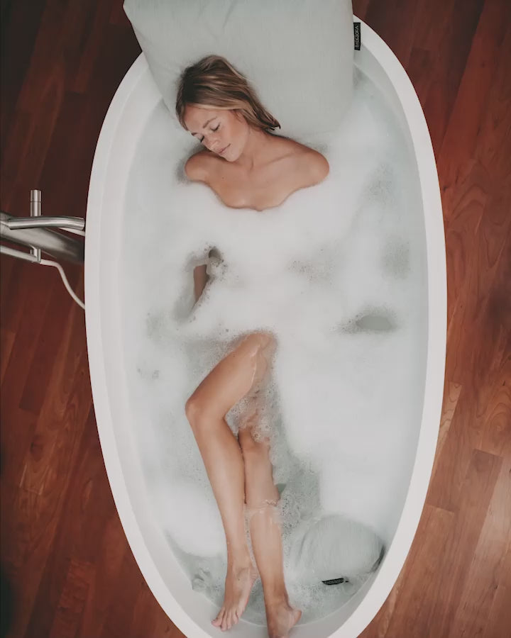Das Video begleitet eine Frau, die ihr Vollbad mit einem Badesofa Rückenkissen und Fußkissen in einer freistehenden Badewanne genießt